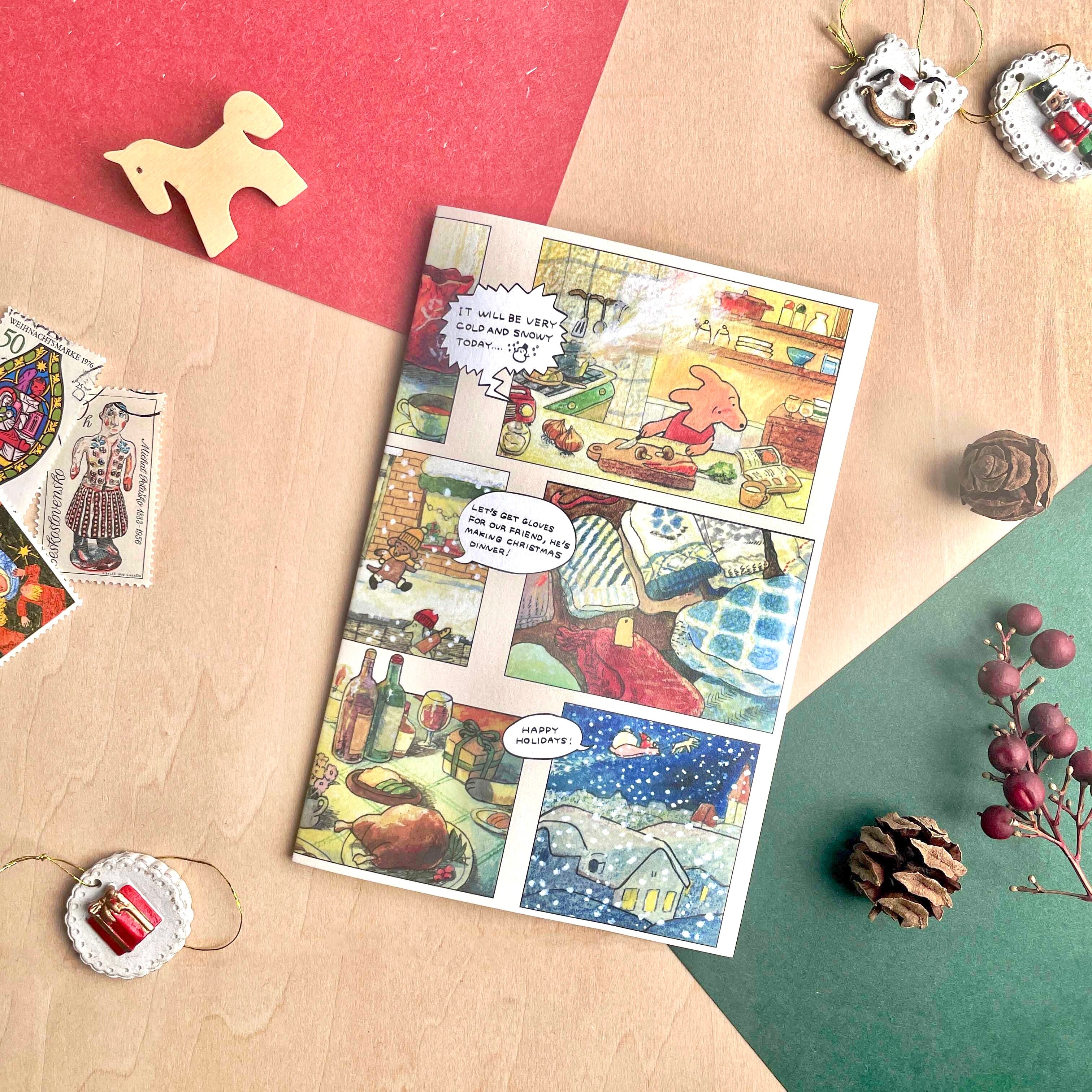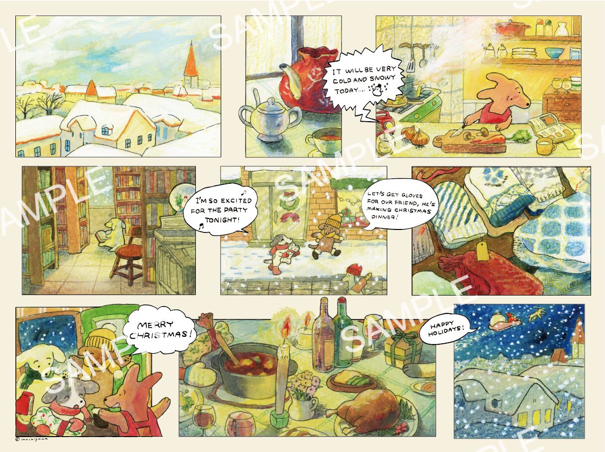 絵本のなかのサンタさんが料理をしたり出かる支度をしたりするシーンが大好きで、カードにも犬たちがクリスマスパーティーのために支度をする様子を描きました。
