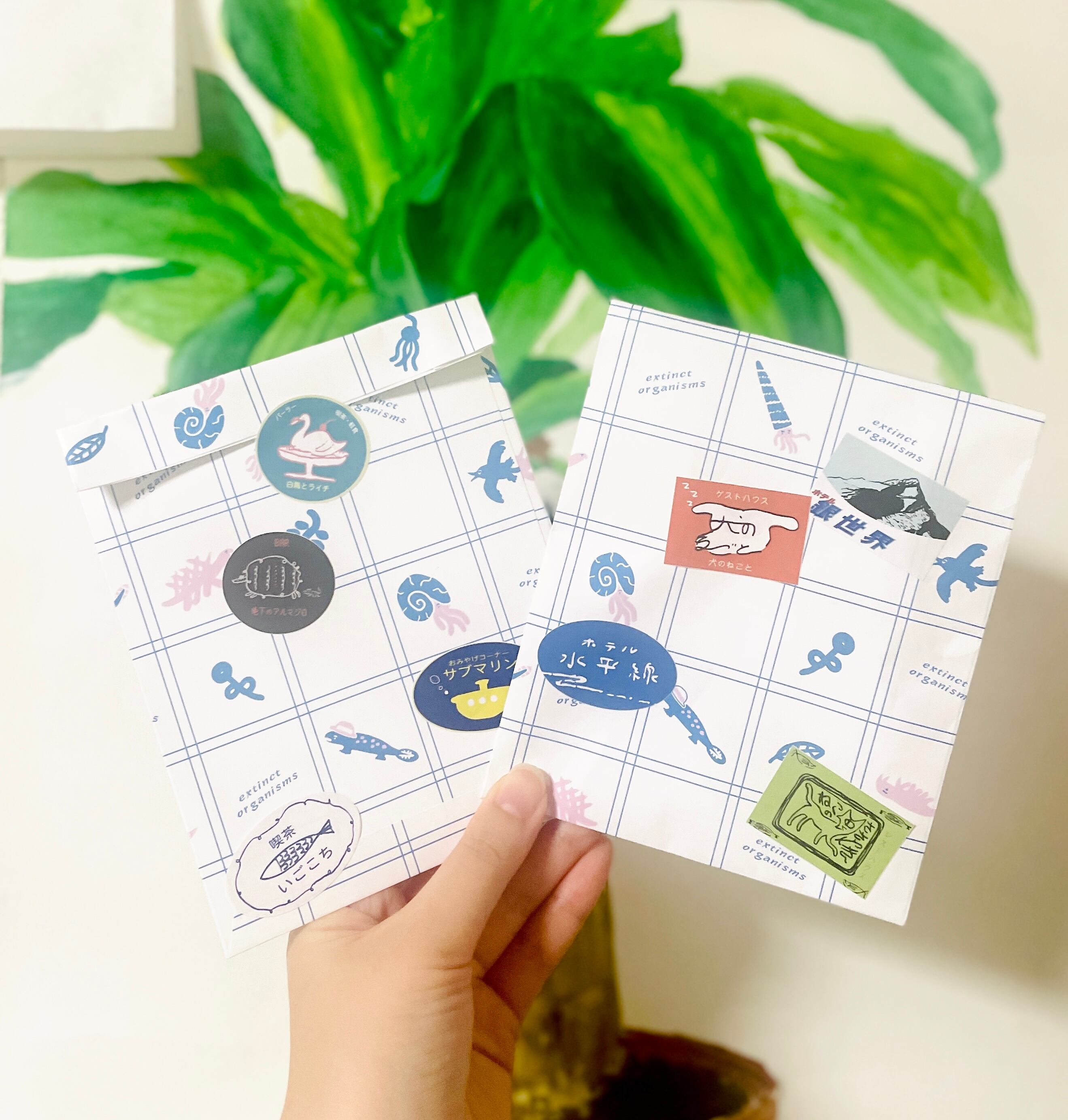 古生物たちのイラストが描かれた、お菓子のおみやげやちょっとした小物を入れるのにちょうどいいサイズの平袋です。5枚入り。